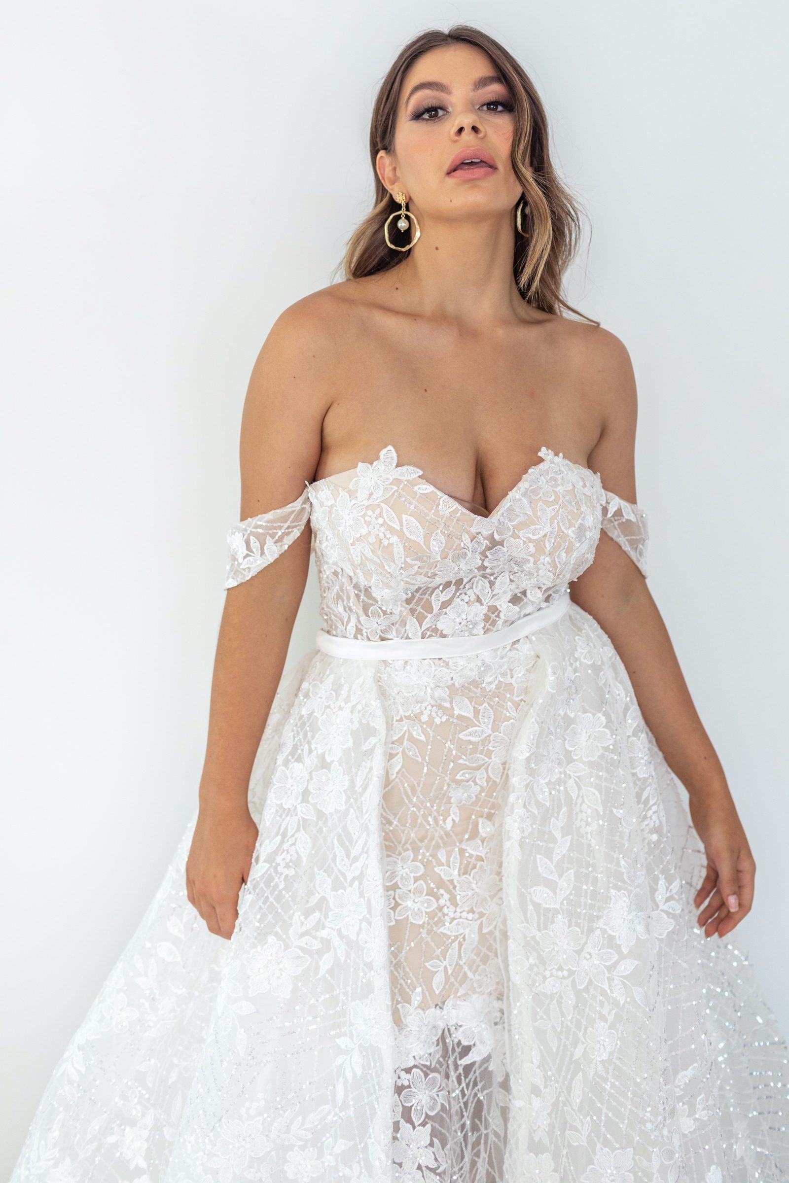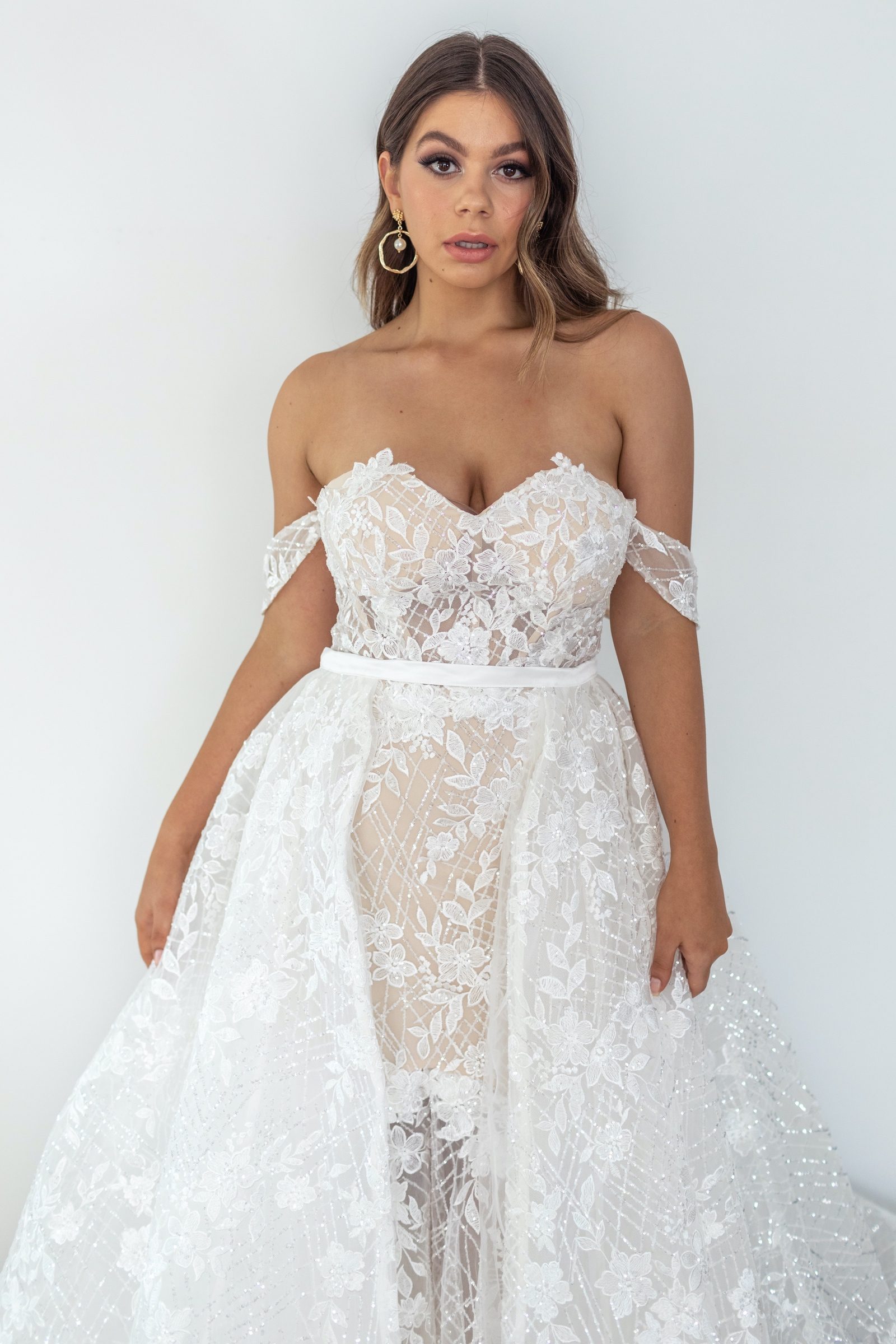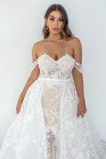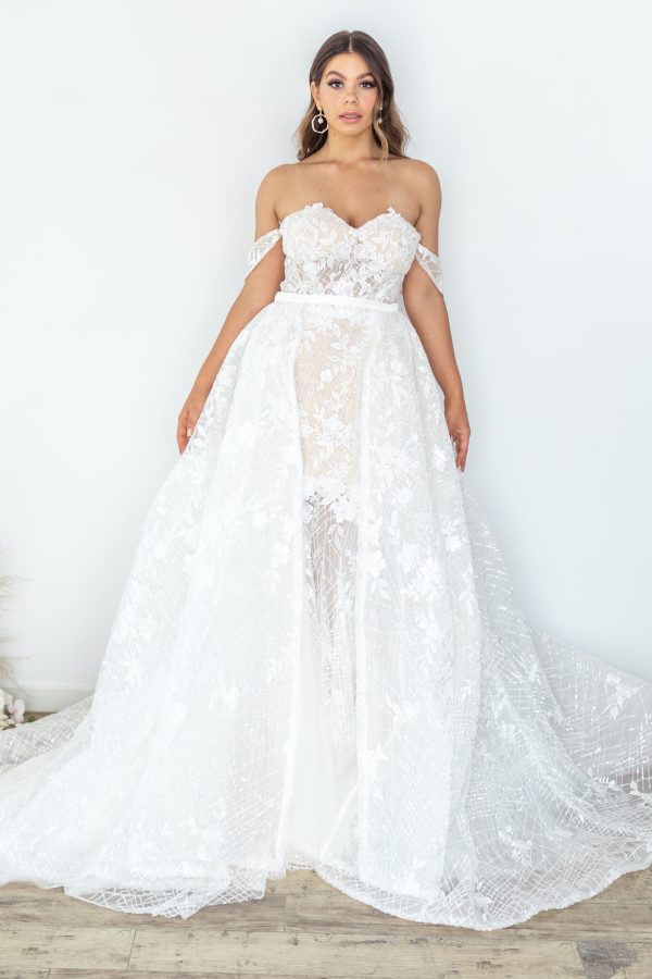 Our Isla Overskirt is a true couture, wow-factor couture look. Made from a matching opulent, shimmering lace and dreamy tulle, it styles perfectly with our ISLA gown to give you that show-stopping look. Luxury has a new name. Shown in ivory.
