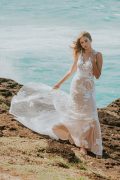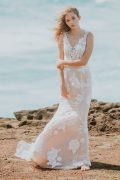 Comfort and class is her main objective. Delicate floral lace appliqués are hand-sewn throughout creating soft and elegant visual appeal. A low v-neckline compliments the front while the back plunges down. Savannah has a sheer bodice with comfortable jersey lining in the skirt.